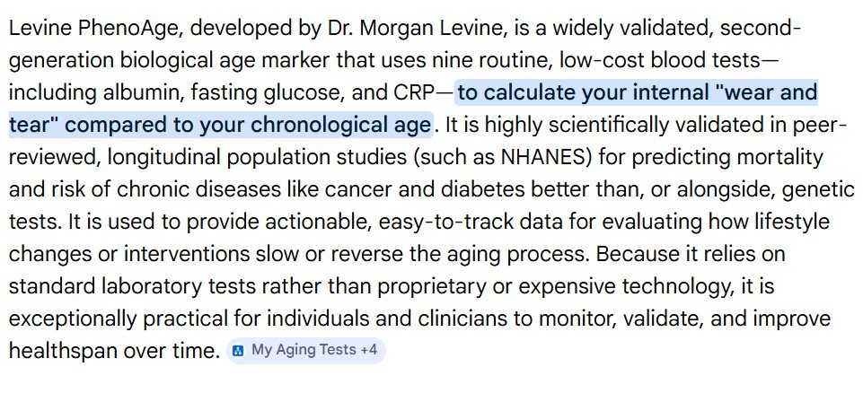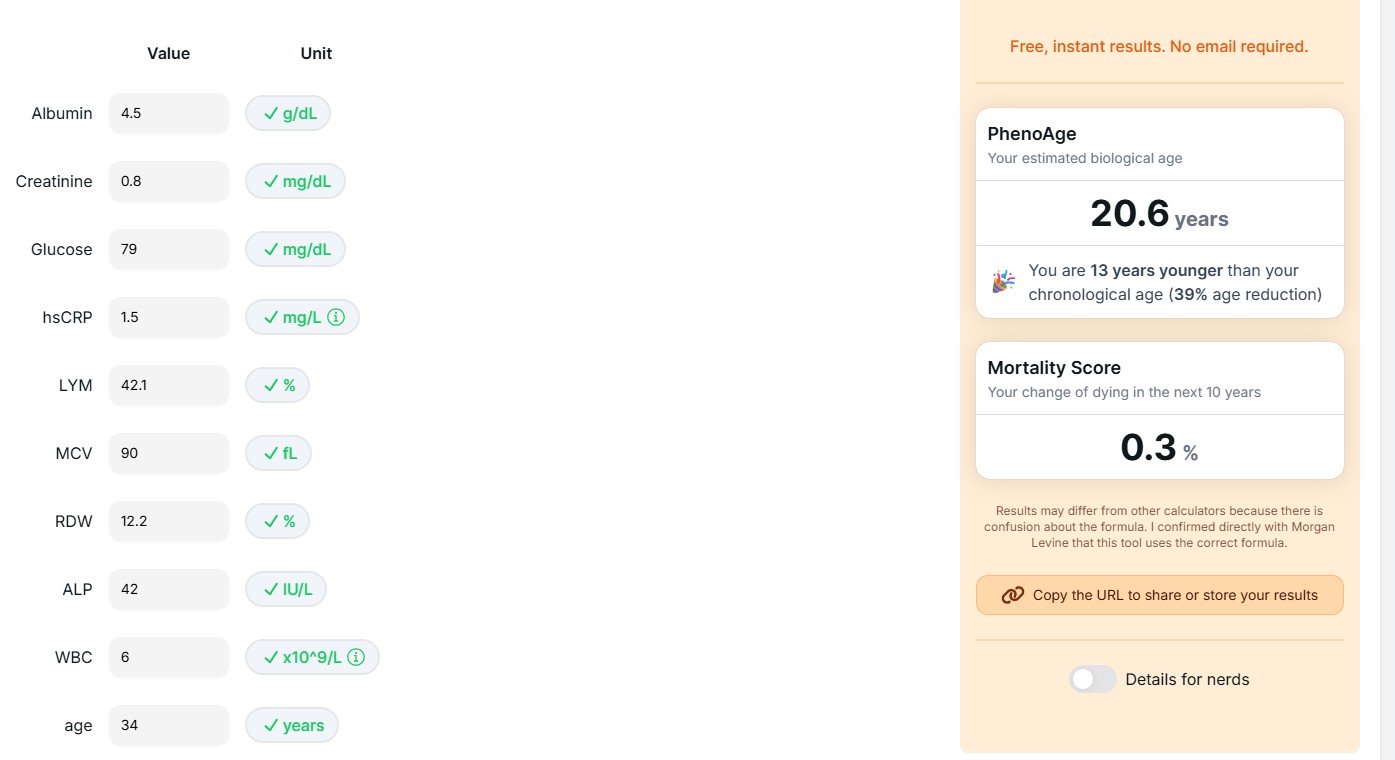 With a lifetime of sustainable, healthy habits, consistent bedtime, a well-planned, simplified whole-food-based diet, and regular strength training (no protein shakes or supplements), she scored a 13-year age reduction (39%) on her biological age, down from 34 to 20.6 years on a Levine PhenoAge Calculator.